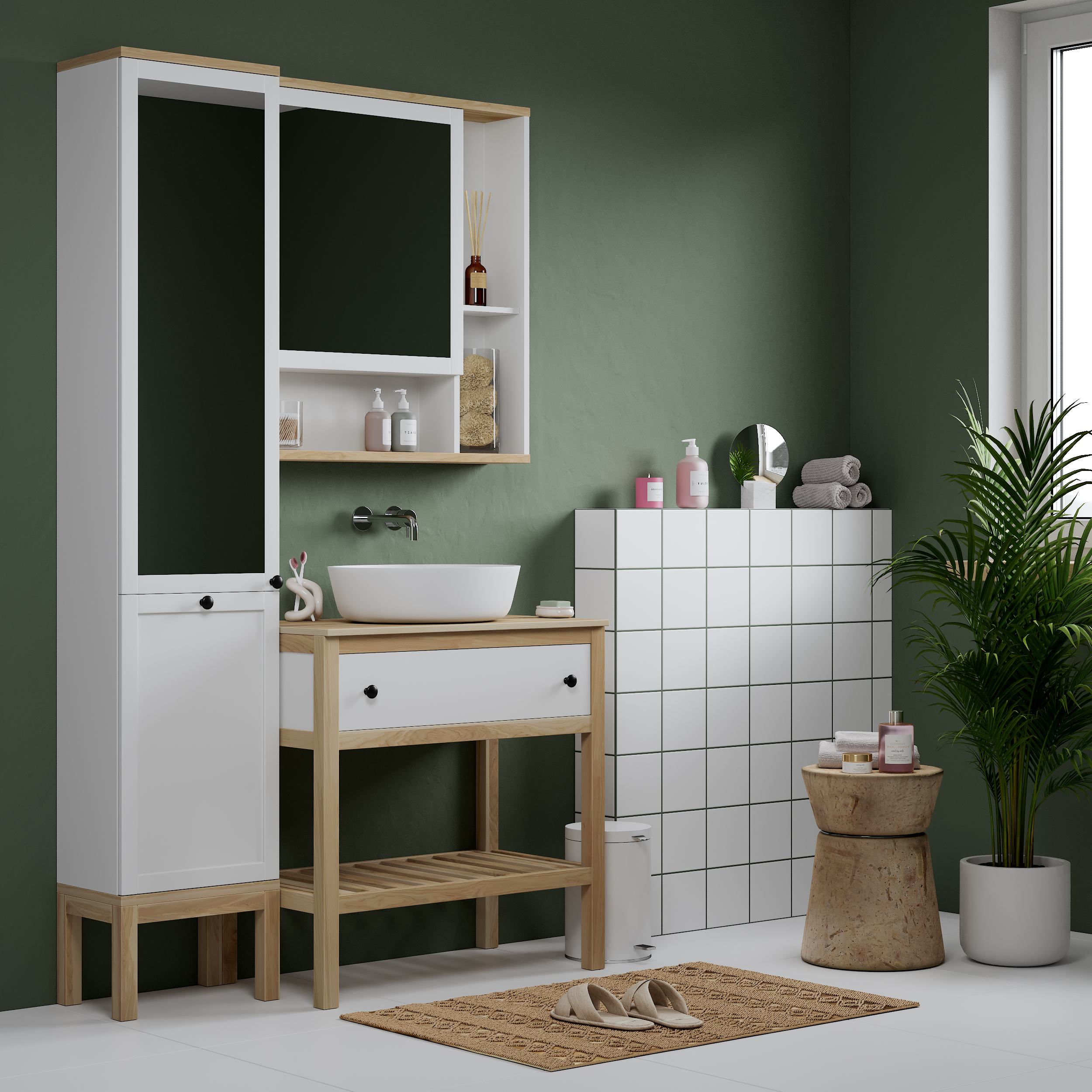 Тумба открытая 800 мм каркас и столешница массив ясеня для накладной раковины, фасады эмаль с одним ящиком и открытой реечной полкой