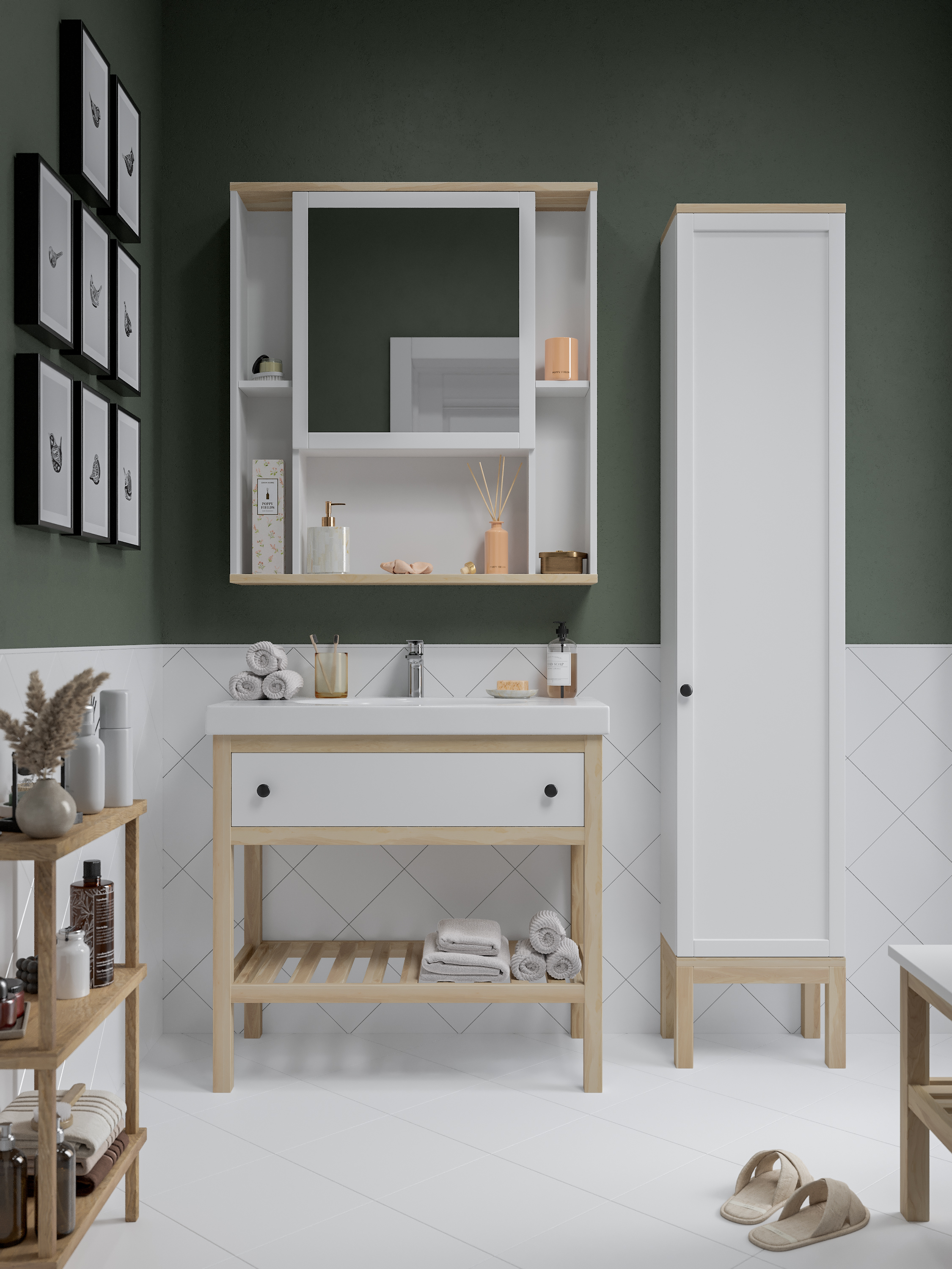 Тумба открытая 800 мм каркас из массива ясеня с раковиной и одним ящиком, фасады белая эмаль