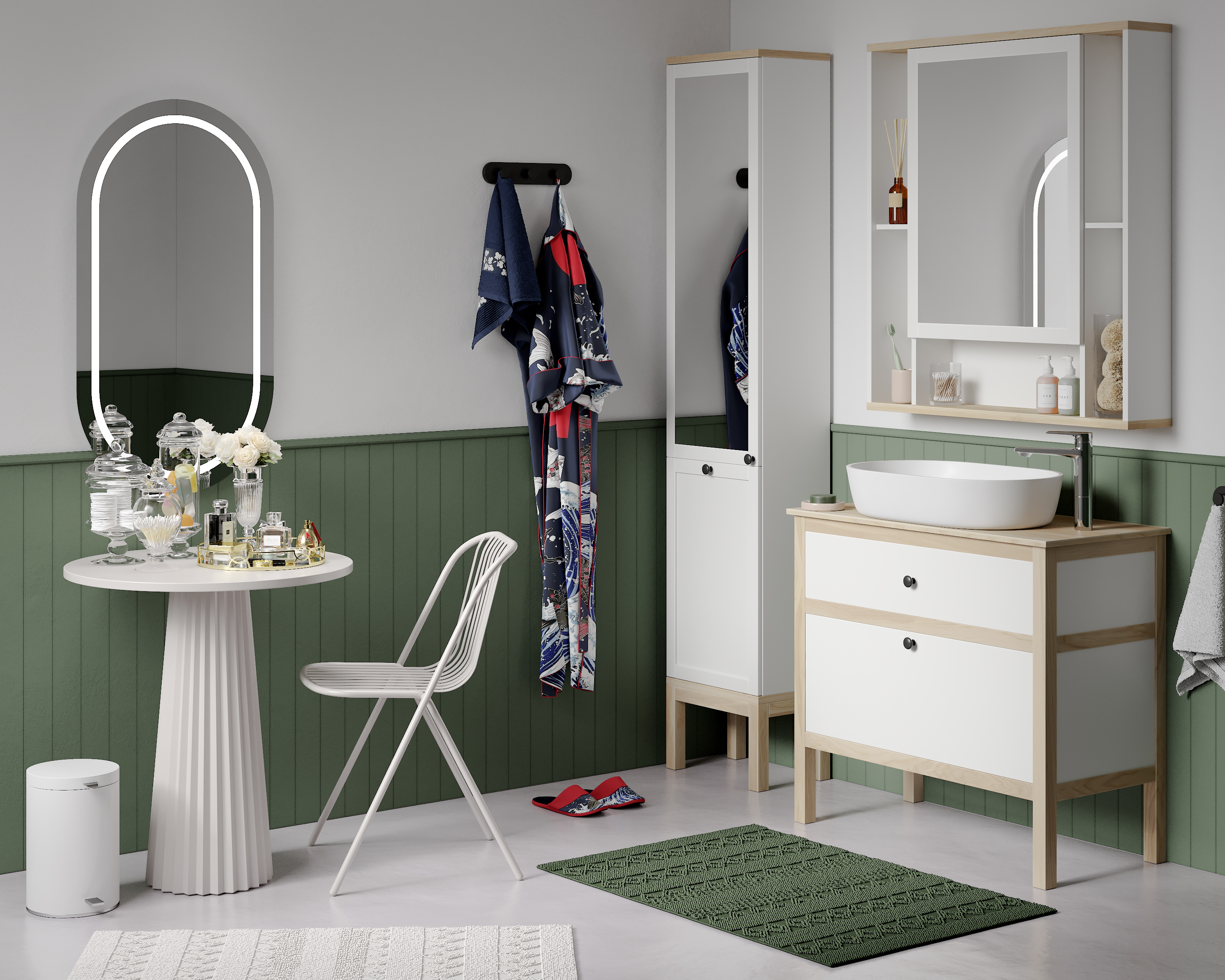 Шкаф-пенал с полками и корзиной для белья, зеркало на эмалированном фасаде из МДФ, опоры массив ясеня